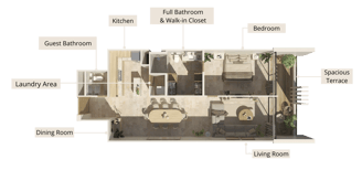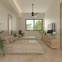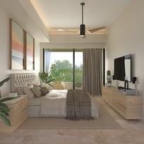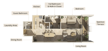 Experience luxury with 102 square meters of space. This exclusive design includes a spacious bedroom with a full bathroom and a walk-in closet, an elegant kitchen, dining area, and living room.