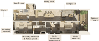This stunning apartment features two spacious bedrooms, each with its own walk-in closet and private bathroom.