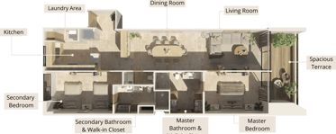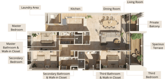 The Penthouse Model C at AURUM offers an impressive 192 square meters of space. This exclusive design boasts three elegant bedrooms, each with its own full bathroom and walk-in closet, providing unmatched privacy and comfort.